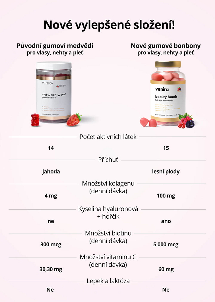 Pracovali jsme celý rok na tom, abychom naše oblíbené medvídky pro vlasy, nehty a pleť posunuli na novou úroveň – a teď je to konečně tady! Seznamte se s vylepšeným složením našeho BESTSELLERU – přichází Beauty Bomb!